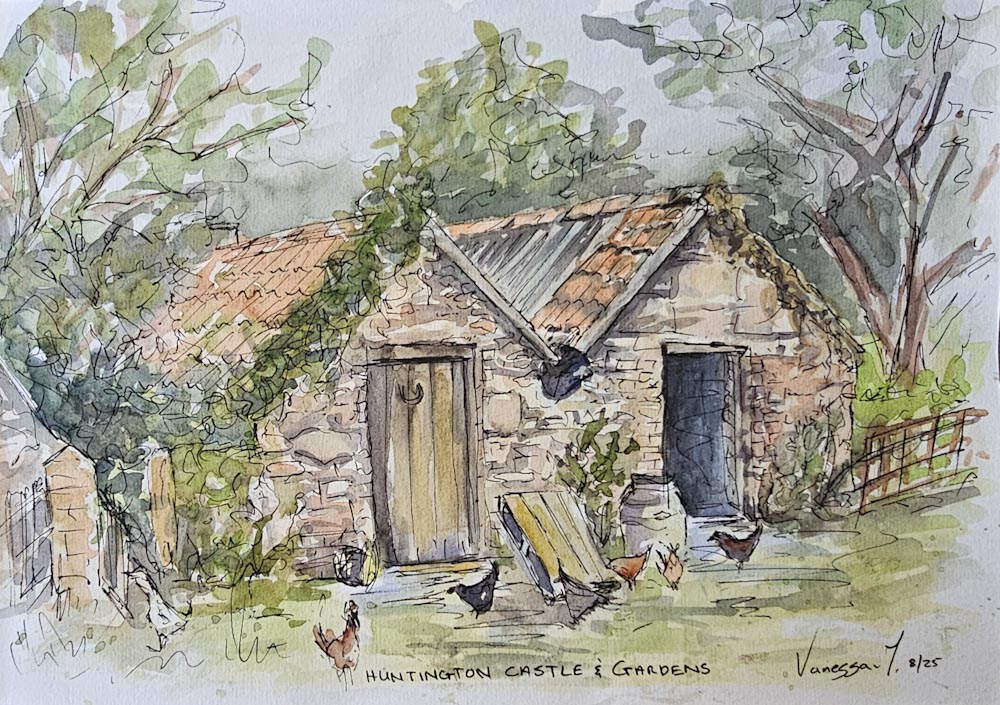 Huntington Castle and Gardens Chicken House – I am sure it is not called the chicken house, but while I was sitting painting, a young man opened the doors and all the chickens came out and wondered over to me, curious to see what I was up to.